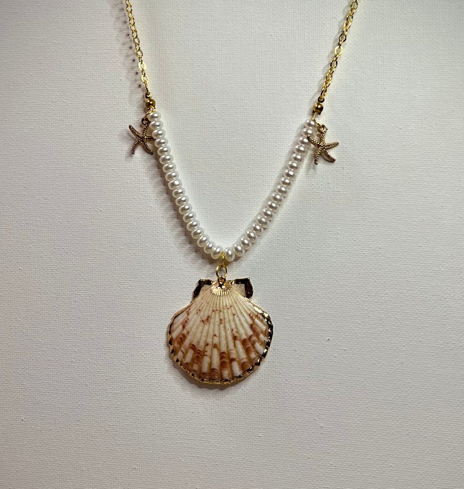 Seashell, white pearls, and golden sparkles come together in a jewel that evokes ocean light and natural elegance.