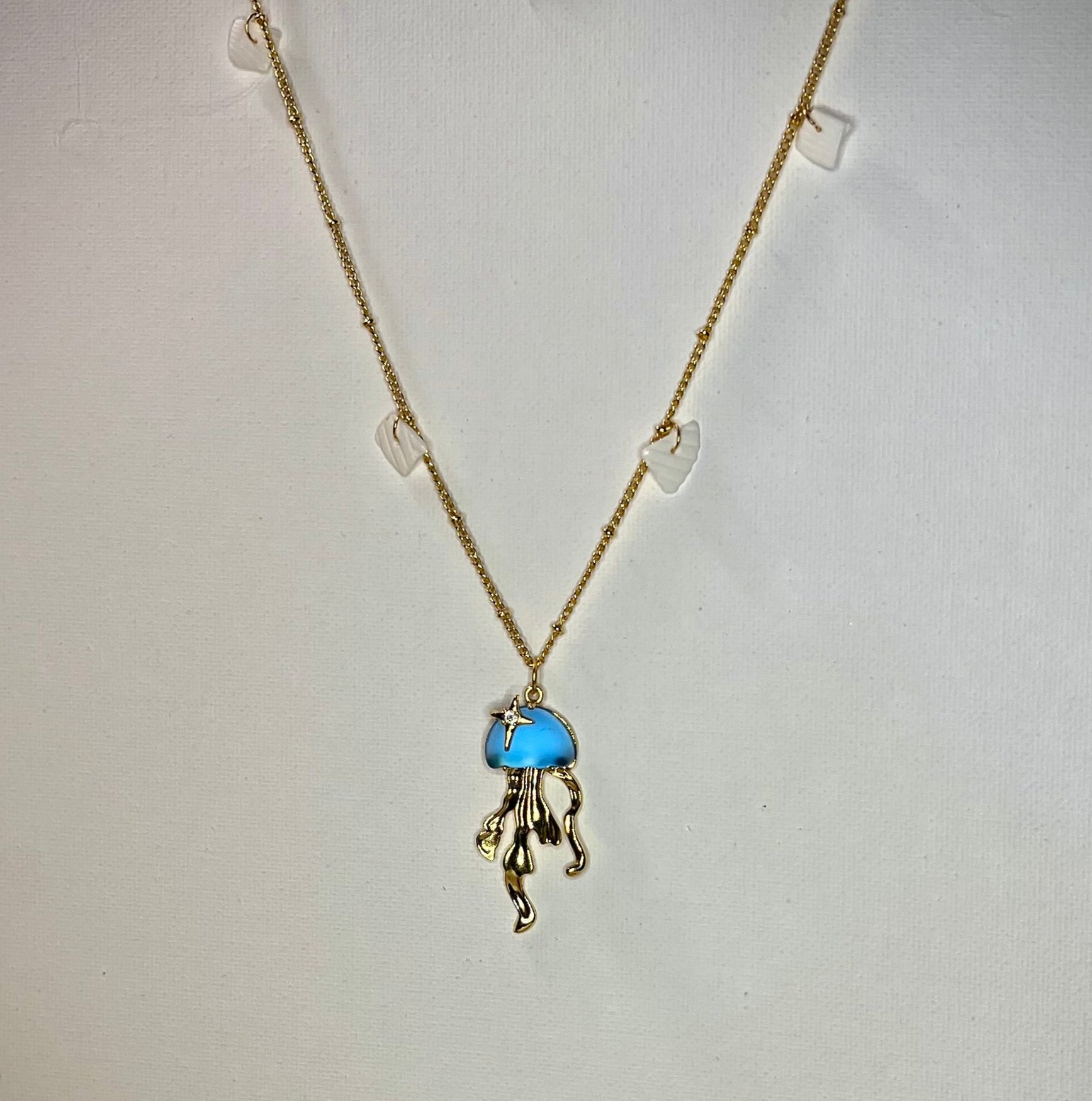 Gold Lip Ball Chain Necklace. A delicate blue jellyfish floats alongside a starfish, creating an ethereal and enchanting scene.