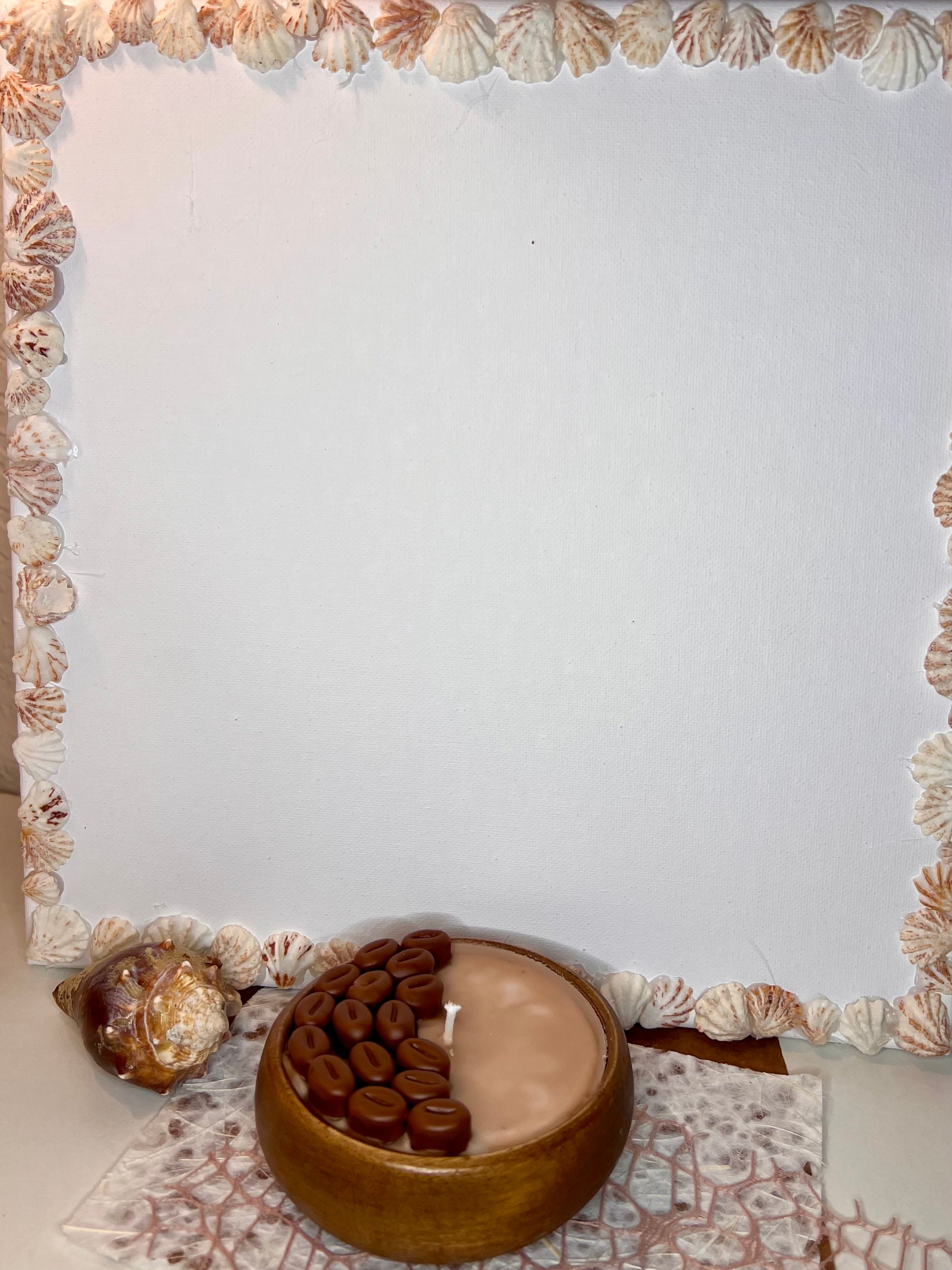 Vela artesanal en cuenco de madera, decorada con granos de café y crema de latte. Aroma cálido a café con leche. Ideal para crear ambientes acogedores con estilo natural.