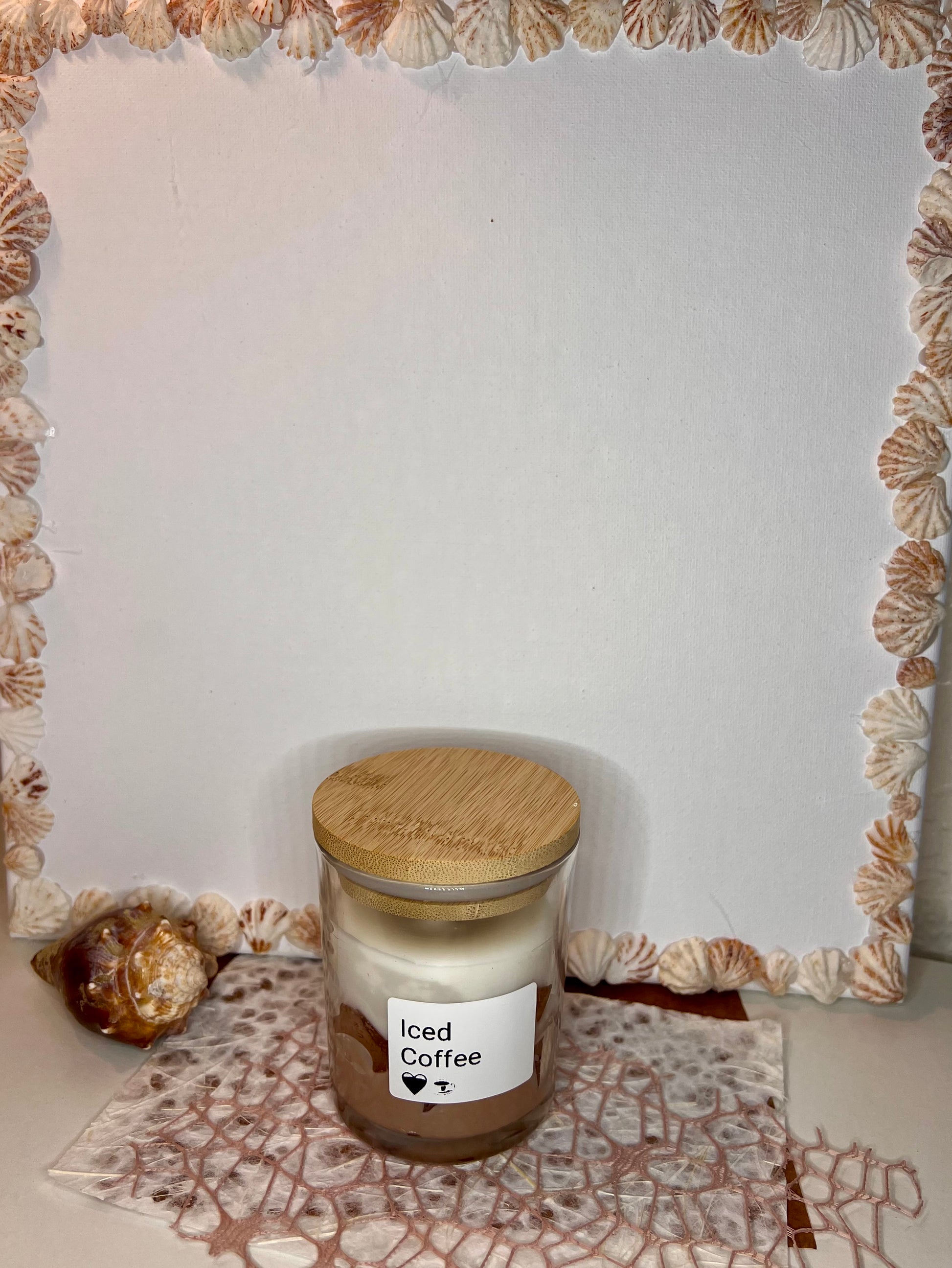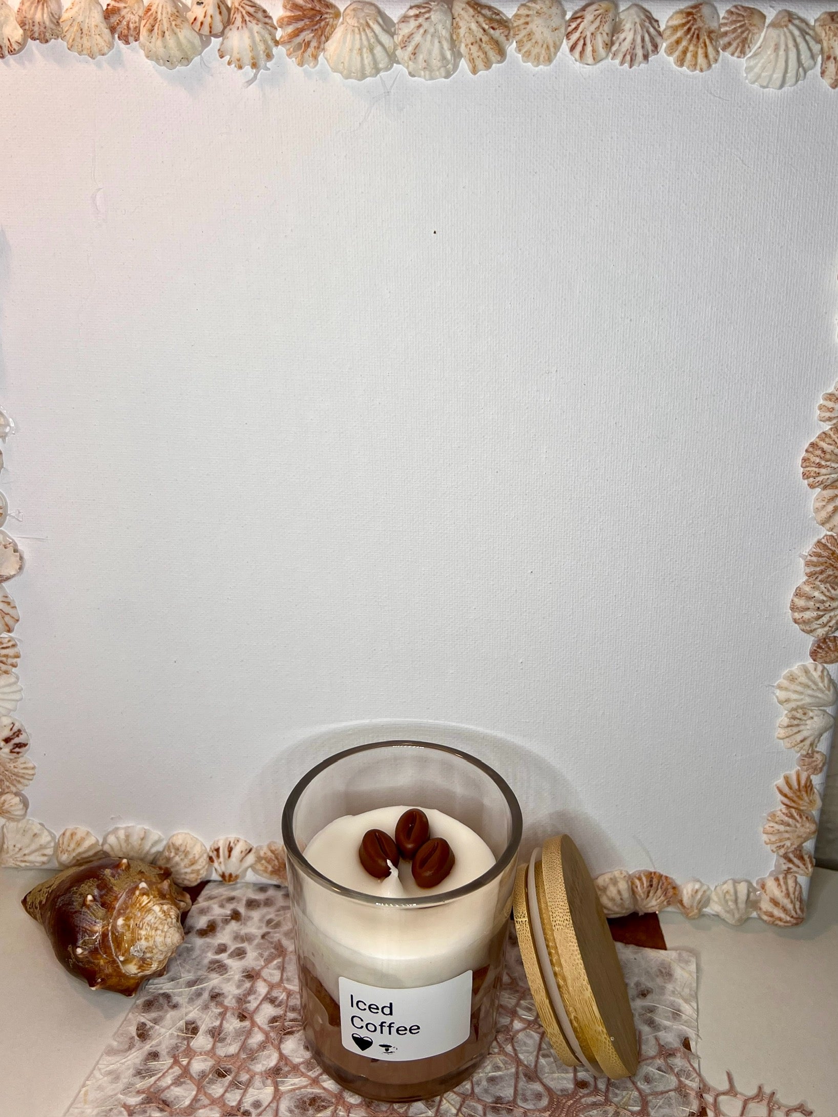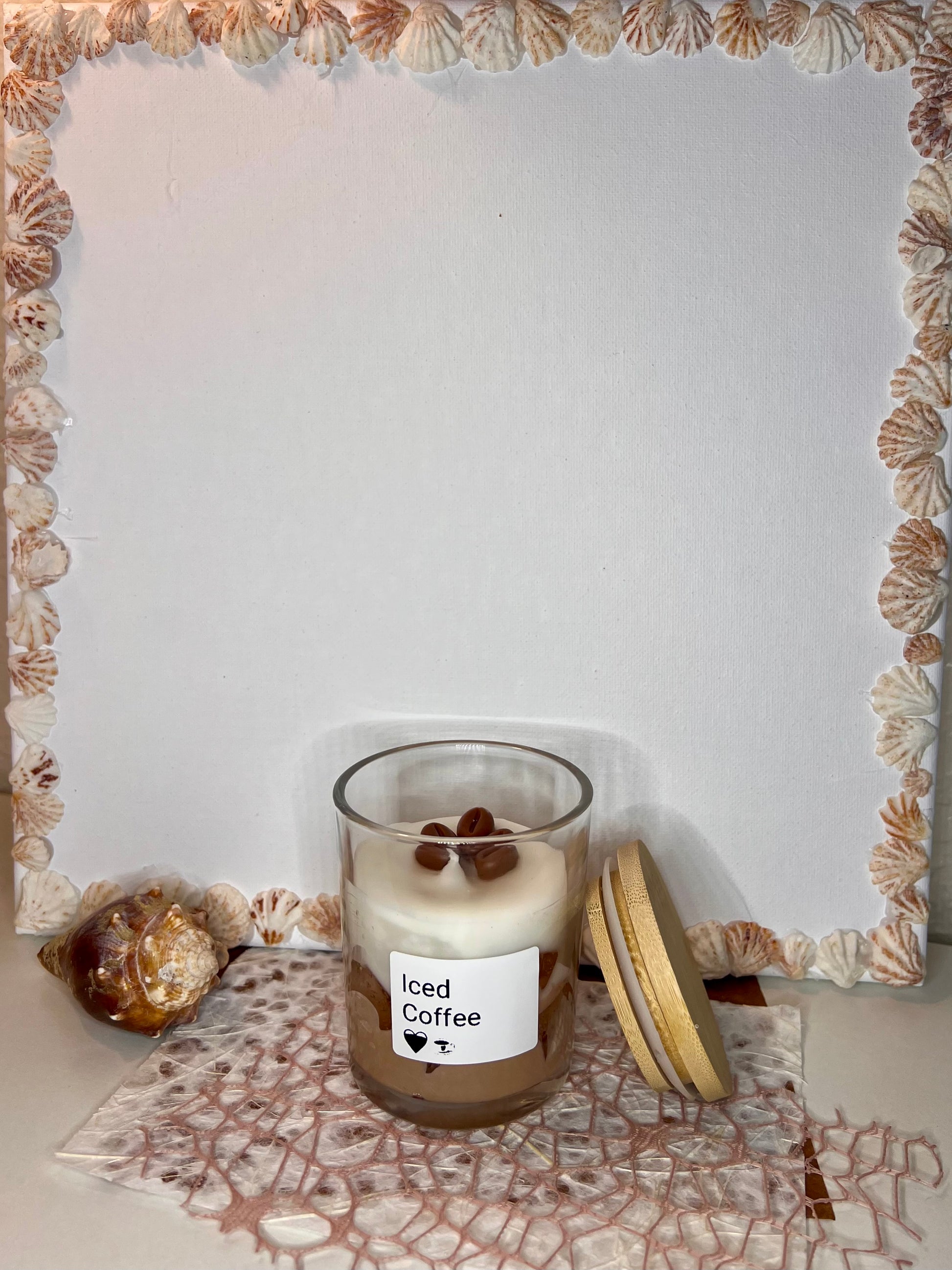 Vela artesanal que imita un café frío, con aroma dulce y decoración estilo frappuccino. Refrescante, acogedora y totalmente prendible.