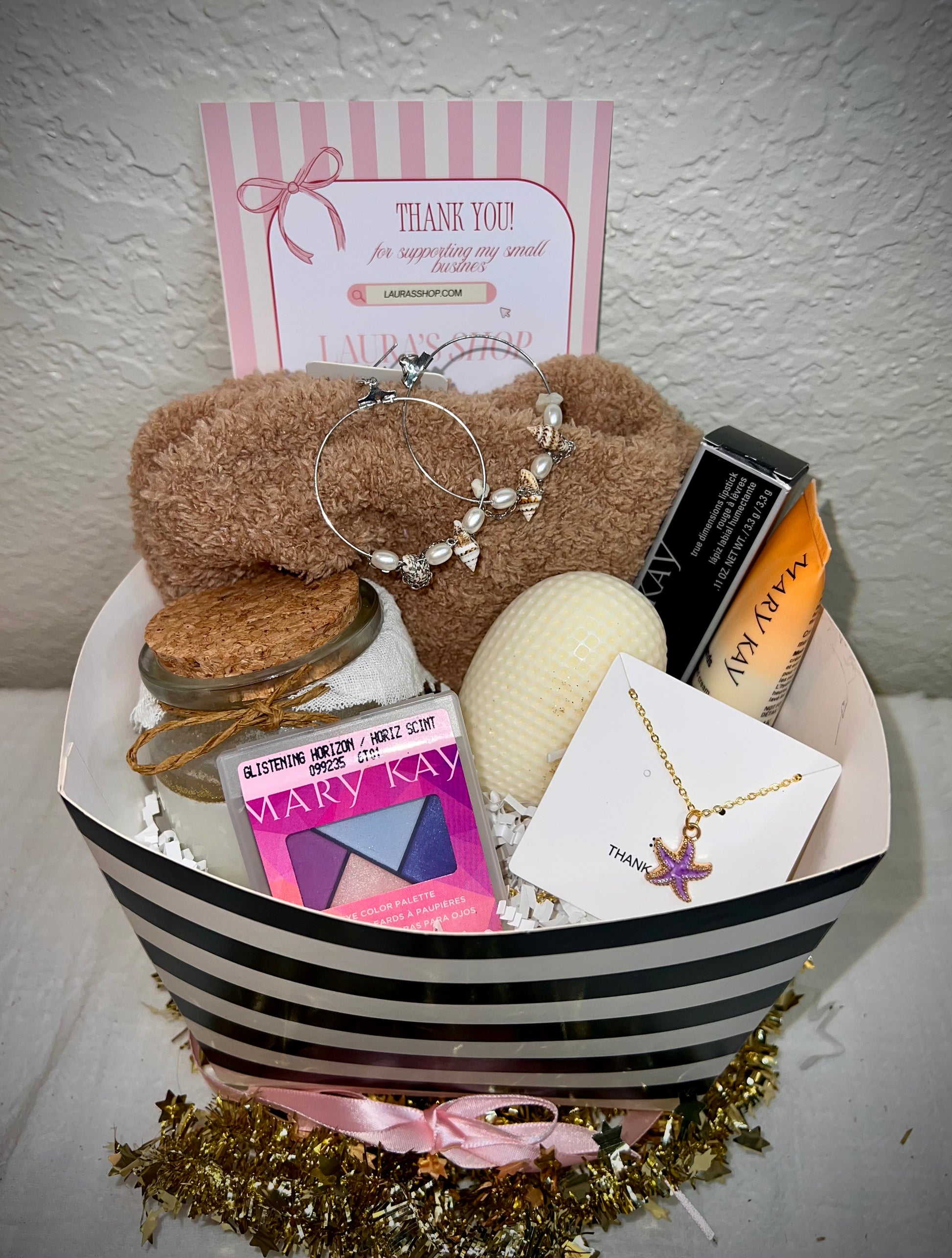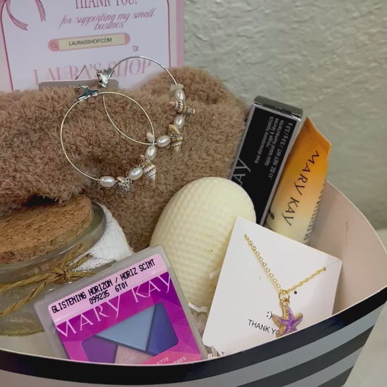 Un detalle premium con collar, paleta de ojos, dos velas, aretes, crema de manos, medias y labial. Elegancia total en una sola cesta.