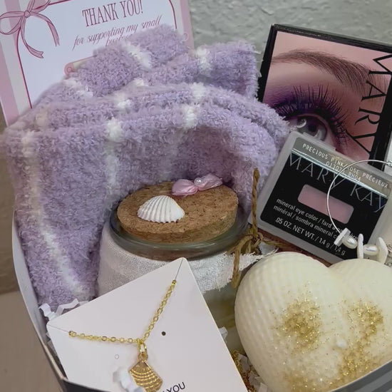 Incluye medias confortables, dos velas, crema hidratante, aretes y un set de ojos más una sombra individual. Un regalo delicado y luminoso.
