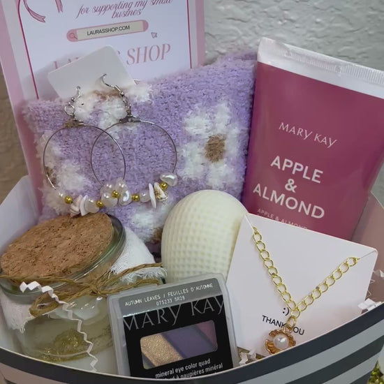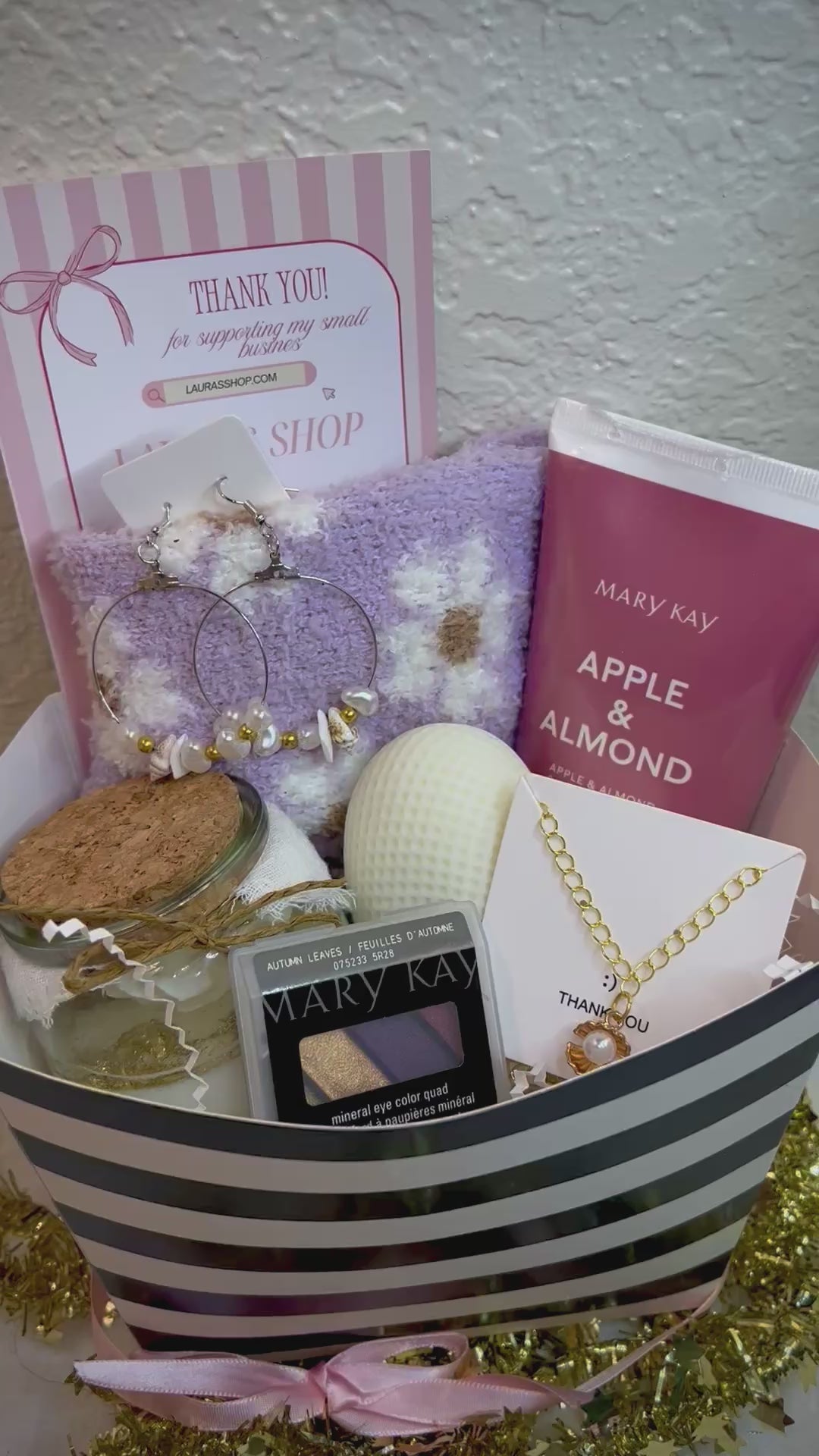 Una mezcla de relajación y belleza con dos velas, paleta de ojos, collar, aretes, medias y un shower gel delicioso.